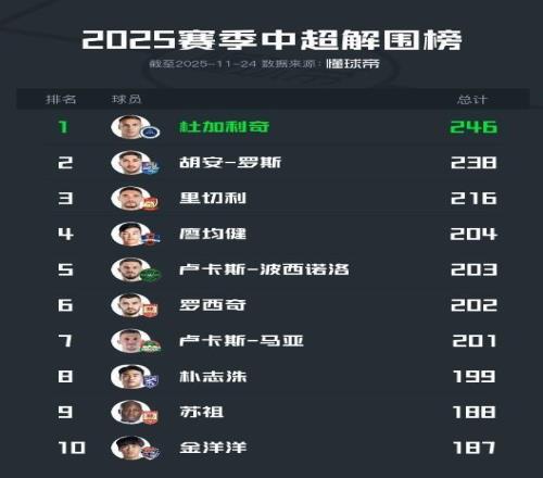 2025中超解围榜:杜加利奇以246次居首本土球员廖均健最多
