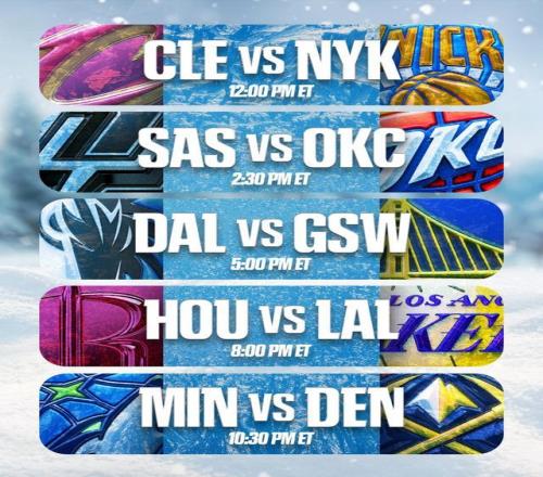 今年的圣诞大战一共有5场,分别是骑士vs尼克斯、雷霆vs马刺、独行侠vs勇士、火箭vs湖人、森林狼vs掘金。
